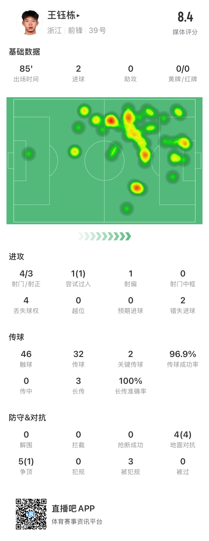 直播吧05月01日讯 中超第10轮,浙江vs长春亚泰。比赛第85分钟,浙江换人调整,王钰栋被童磊换下。本场比赛,王钰栋头顶脚踢贡献了两粒进球。